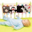 This 23 inch long crib bumper has four soft, double sided panels, each featuring their own activity; sheep slides up and down, flip open pig to find the mirror, spin the cow and hear it click, and press the star for soft lights and music! Plays "Fur Elise" and with every touch brings fun crinkle sounds too! Turn the bumper over and find four black and white visually stimulating panels for newborns. Attaches easily to cribs with a simple hook and loop closure. Read more...